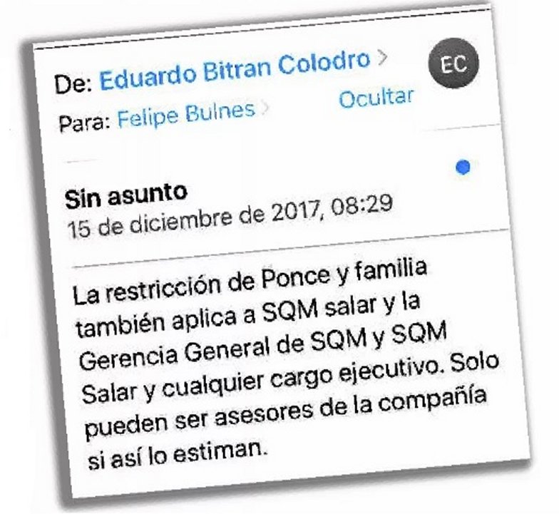 De acuerdo al documento dado a conocer este martes por El Mercurio, el ex ministro de Obras Públicas sostuvo que la restricción impuesta a la familia Ponce en la negociación "también aplica a SQM Salar y la Gerencia General de SQM y SQM Salar y cualquier cargo ejecutivo", sin embargo, "pueden ser asesores de la compañía, si así lo estiman".