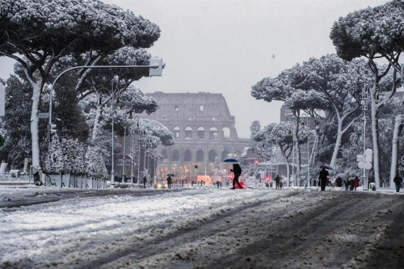 Una intensa nevada cayó la madrugada de este lunes en Roma, causando problemas en el tránsito y suspensión de clases en los colegios. Pese a esto, cientos de romanos y de turistas se han volcado a las calles para disfrutar del sobrecogedor espectáculo natural y de la belleza de los monumentos de la capital italiana, como el Coliseo o la plaza de San Pedro, cubiertos totalmente de blanco.