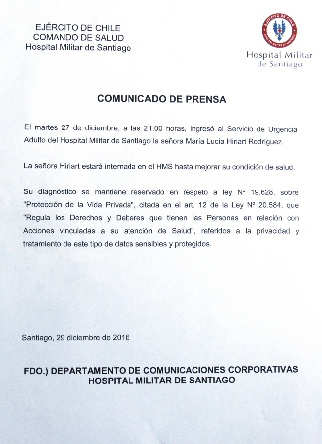 A través de un comunicado, el Hospital Militar detalló que la viuda de Pinochet "el martes 27 de diciembre, a las 21:00 horas, ingresó al Servicio de Urgencia Adulto" del recinto y que "estará internada hasta mejorar su condición de salud".