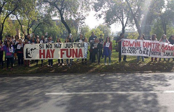 El grupo "Comisión Funa" organizó este sábado en Las Condes una manifestación en las afueras del domicilio del ex coronel Edwin Dimter Bianchi, acusado del crimen de Víctor Jara, como parte de sus "funas históricas", que buscan "impedir que los criminales de la dictadura de Pinochet queden en la impunidad".