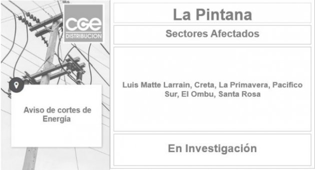 | El gerente de instituciones y comunidad de CGE, Juan Carlos Oliver, indicó que "tenemos una zona en La Pintana y Puente Alto donde hay 7.300 clientes (sin luz) producto de incidentes que se están produciendo en la zona, lo que no ha permitido poder entrar a reparar".