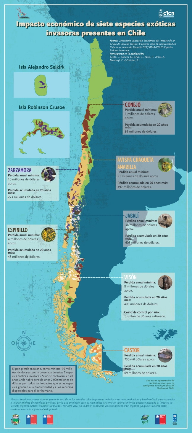 El análisis, encargado por el Proyecto GEF Especies Exóticas Invasoras del Ministerio del Medio Ambiente y financiado a través del Programa de las Naciones Unidas para el Desarrollo (PNUD), advirtió que de no hacer nada para controlar a estas especies, en 20 años Chile habrá perdido -en el escenario más favorable- más de 1.991 millones de dólares.