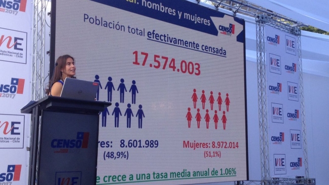La directora del INE, Ximena Clark, especificó que la población efectivamente censada en Chile, desagregada por sexo, es de 8.601.989 hombres (48,9 por ciento) y 8.972.014 mujeres (51,1 por ciento).