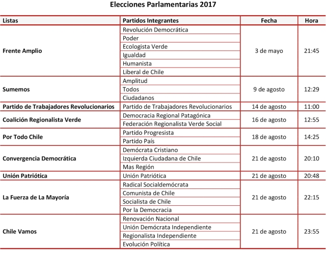 Cabe destacar, que tras vencer plazo para formalizar pactos y declarar candidaturas este lunes 21 de agosto, el Servicio revisará la documentación recibida para verificar que cumpla con todos los requisitos que instruye la legislación vigente y el 2 de septiembre el Consejo Directivo del Servel publicará las resoluciones de aceptación o rechazo de las candidaturas presidenciales y parlamentarias en el Diario Oficial y, en el caso de las de cores, en los diarios regionales de mayor circulación.