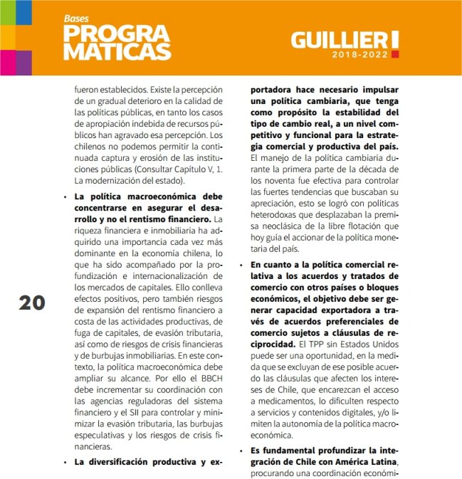 "La diversificación productiva y exportadora hace necesario impulsar una política cambiaria, que tenga como propósito la estabilidad del tipo de cambio real, a un nivel competitivo y funcional para la estrategia comercial y productiva del país", dice el texto que aparece en la página 20.