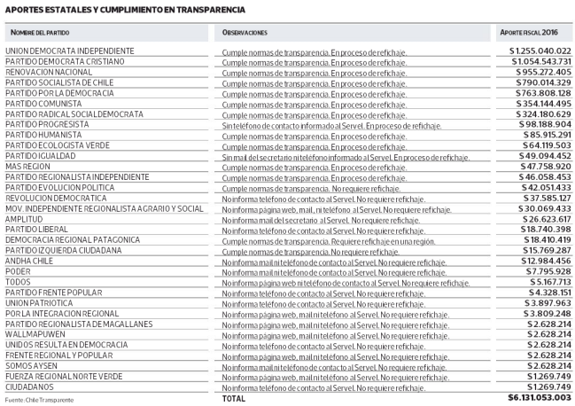 El detalle de transparencia de cada partido (Foto: La Tercera)