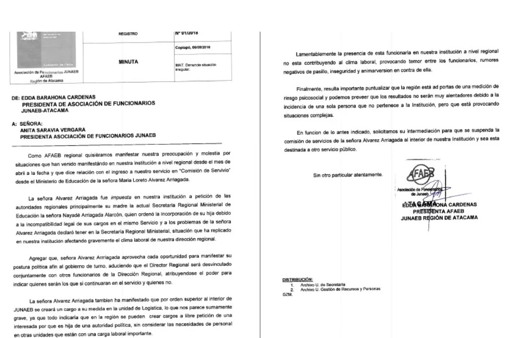La denuncia fue realizada a través de una carta enviada por la presidenta regional de la Asociación de Funcionarios de la Junaeb, Edda Barahona, a la presidenta nacional del mismo gremio que fue publicada en la página web de los funcionarios, en la que cuestionan la designación de María Loreto Álvarez.