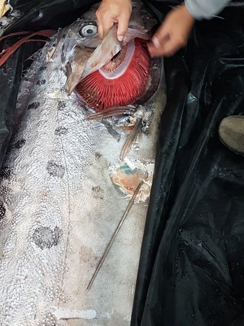 Pescadores artesanales de Iquique encontraron este fin de semana un ejemplar hembra de pez remo. El animal -de nombre científico Regalecus Glesne- mide cinco metros de largo, pesó cerca de 150 kilos y quedó atrapado en las redes de una embarcación que buscaba albacoras.