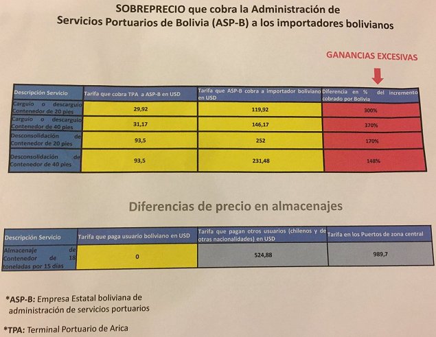 Por el manejo de la carga de un contenedor de 20 pies, el Puerto de Arica cobra 93,5 dólares y la agencia boliviana 252 dólares, generando una diferencia de 170 por ciento. Para un contenedor de 40 pies, el Puerto cobra a ASP-B 93,5 dólares y la empresa boliviana 231,48 dólares, generando una diferencia de 148 por ciento.