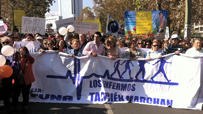 Desde antes de las 12:00 horas se desarrolla en Santiago la denominada "marcha de los enfermos", organizada por el periodista Ricarte Soto, para pedir ayuda del Estado en la adquisición de medicamentos de alto costo.