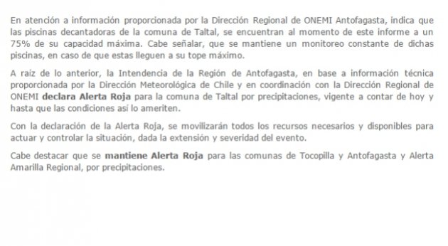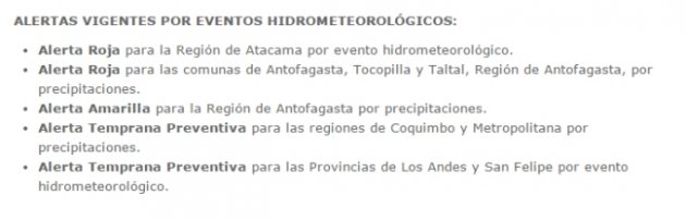 20150324130517 | Según el último balance de la Onemi, se mantiene la alerta temprana preventiva para las regiones de Antofagasta y Coquimbo, así como alerta amarilla para Atacama.