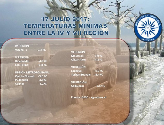 En O'Higgins, las mínimas se registraron en Mostazal y Olivar Alto, con -3,9 y -4,8 grados Celsius, respectivamente.