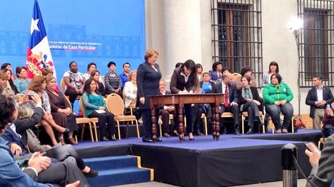 La Presidenta Michelle Bachelet promulgó este domingo la Ley de Trabajadoras de Casa Particular, la cual modifica la jornada de descanso, remuneración y otorga el domingo como feriado irrenunciable a todas las trabajadores puertas adentro.