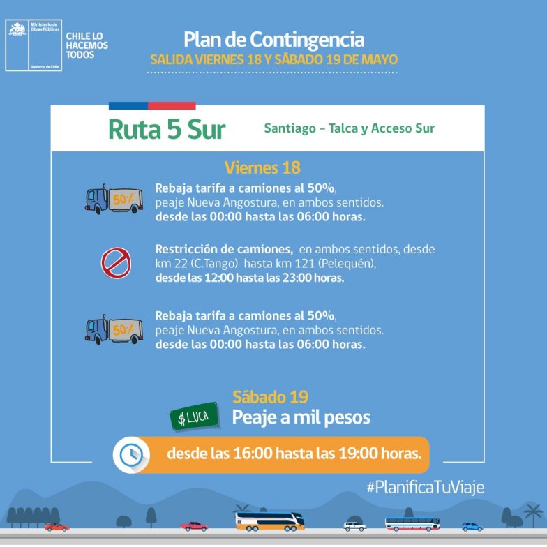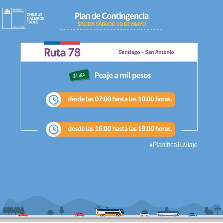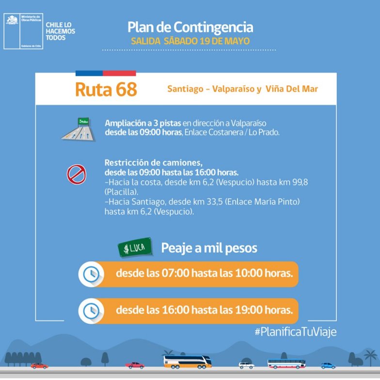 "Desde el sector de la costanera, por la Ruta 68, se realizará un 3x1 hasta el peaje Lo Prado. En la Ruta 5 Sur, el peaje estará a mil pesos desde las 07:00 hasta las 10:00 de la mañana. En la Ruta 78 habrá rebaja de peaje a mil pesos desde las 07:00 hasta las 10:00 de la mañana y posteriormente desde las 16:00 hasta las 19:00 horas", detalló el mayor Carlos González, de la 32a Comisaría de Tránsito.