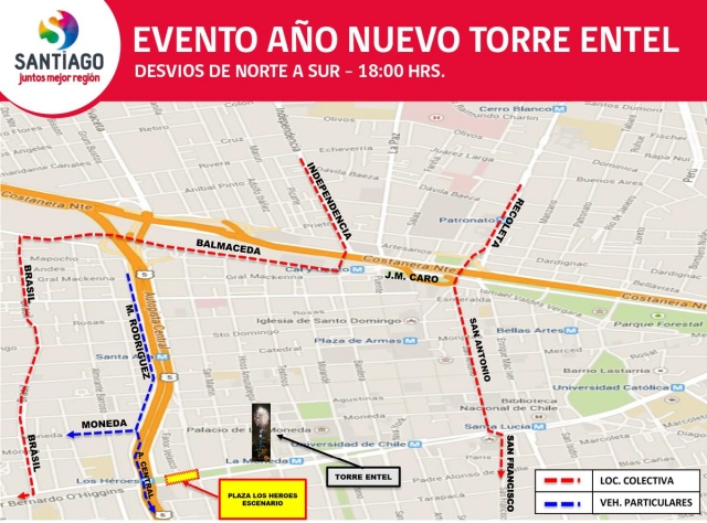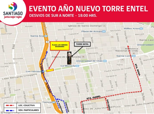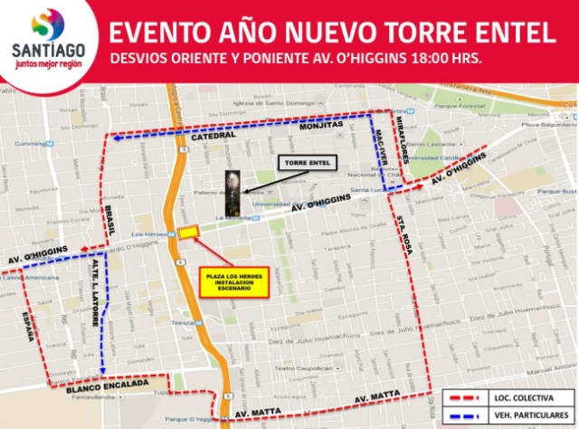 El mayor Víctor Vielma, de la Prefectura Tránsito y Carreteras, detalló que "para el aislamiento del sector Torre Entel, fuegos pirotécnicos, la planificación contempla el desvío de la línea (Alameda Bernardo) O'Higgins en ambos sentidos a contar de las 18:00 horas".