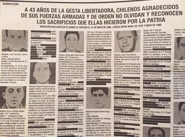 Una polémica generalizada causó un inserto que apareció publicado este domingo en el diario La Tercera, en el que se recordaba a 46 ex militares "caídos" en la dictadura, tanto en organizaciones de derechos humanos, como en los propios trabajadores del medio, que rechazaron esta publicación.