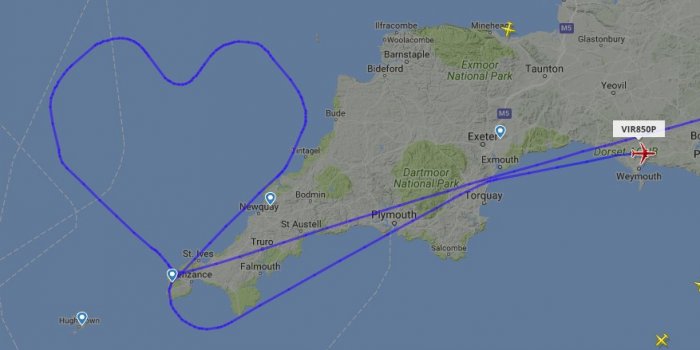El vuelo A330 de Virgin Atlantic realizó un sorpresivo desvío en su trayectoria cuando estaba por llegar a Inglaterra. El piloto decidió hacer una figura de corazón, que fue captada por el portal FlightRadar. El avión no llevaba pasajeros a bordo al momento de la maniobra.