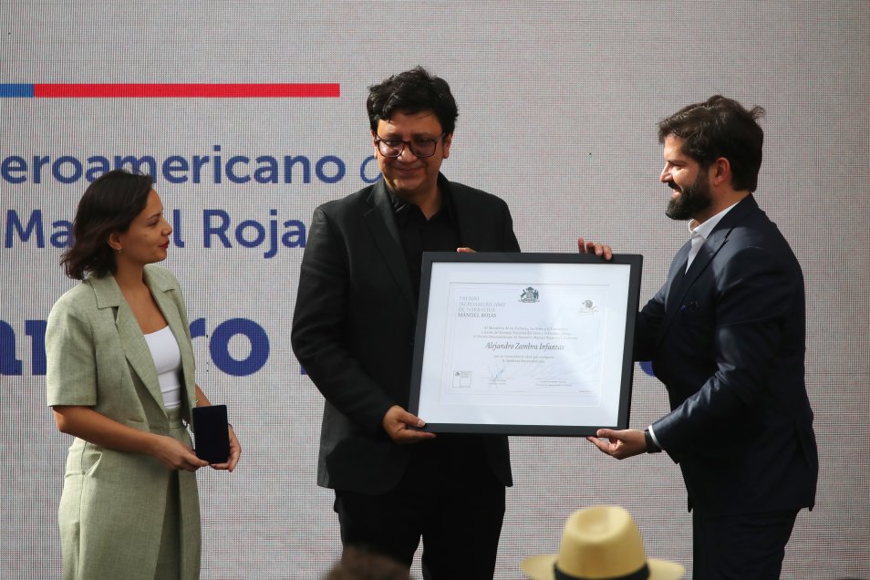 Los autores Alejandro Zambra y Rosabetty Muñoz llegaron hasta el Patio de Los Naranjos de La Moneda, para recibir la tarde del jueves sus premios iberoamericanos de literatura. Zambra, de 49 años y autor de "Bonsai", "Mis Documentos" y "Facsímil ", entre otros, fue galardonado con el Premio Iberoamericano de Narrativa Manuel Rojas 2023.