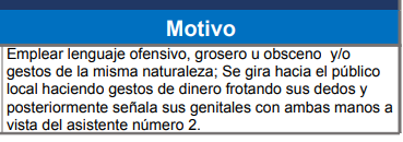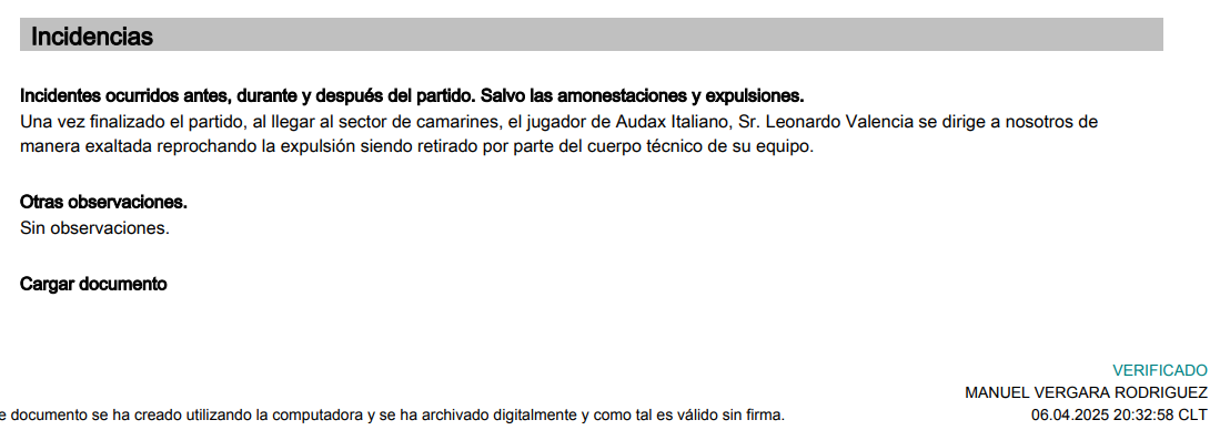 El colegiado continuó en la zona de "incidencias", indicando que el audino se dirigió a encarar al cuerpo arbitral en la zona de camarines.