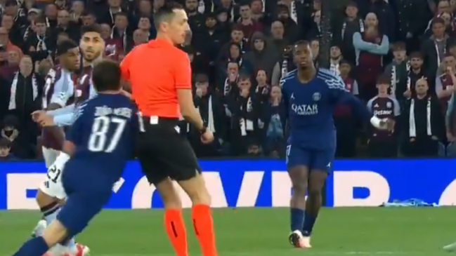 El árbitro español José Sánchez le dio un codazo sin intención al jugador portugués de PSG Joao Neves. Tras esto, el juez paró el juego y fue a revisar al futbolista, que le protestó por el golpe.