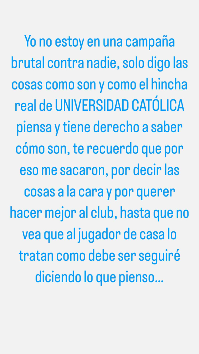 Castillo también remarcó que "no estoy en una campaña brutal con nadie, solo digo las cosas como son, y como el hincha real de Universidad Católica piensa y tiene derecho a saber".