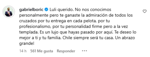"Luli querido. No nos conocimos personalmente, pero te ganaste la admiración de todos los cruzados por tu entrega en cada pelota, por tu profesionalismo, por tu personalidad firme, pero a la vez templada", le escribió el Mandatario a Aued en Instagram.