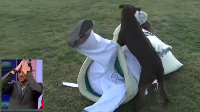 "¡Ayúdenme!": Perrito se quiso "comer" a un corpóreo de empanada en vivo