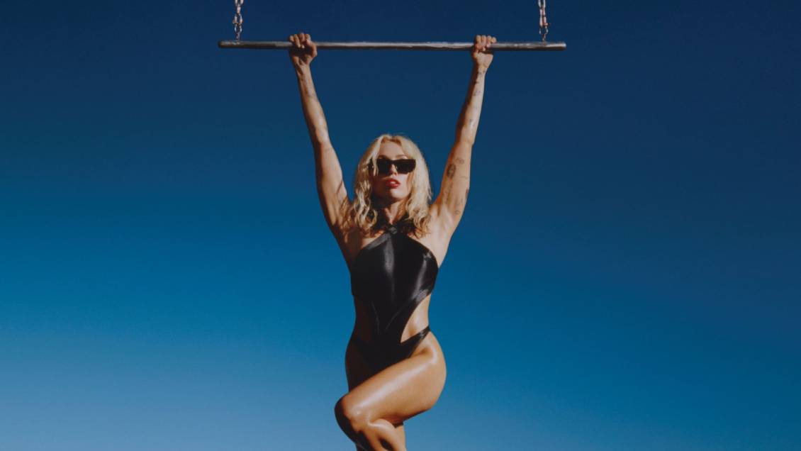 La portada del álbum también fue revelada: aparece Cyrus con un leotardo negro, anteojos de sol y tacones, balanceándose desde una barra de trapecio contra un fondo azul profundo.