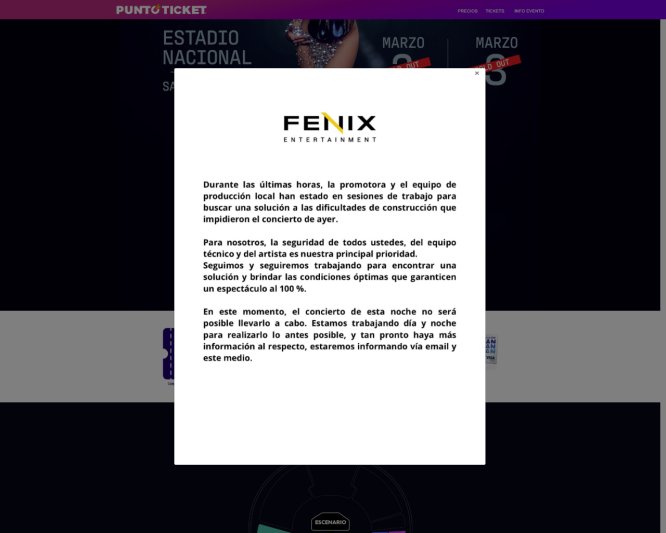 Además, en el propio sitio web de la ticketera aún se ve el reporte de Fenix del pasado lunes -recociendo problemas y anunciado que la segunda fecha tampoco sería realizada-; y en la sección de devoluciones no hay detalles sobre este caso.