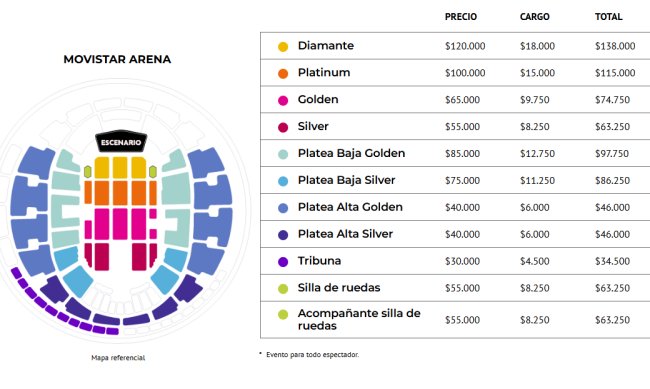 La distribución contempla sólo asientos y no una cancha de pie, con las entradas más caras -categoría diamante- a un valor de 138.000 pesos, con cargos incluidos.