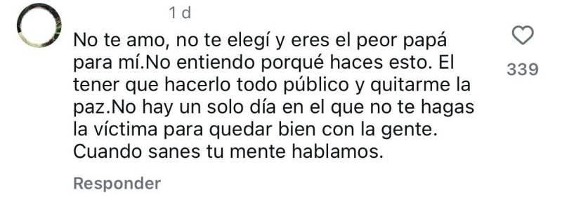 "No te amo, no te elegí y eres el peor papá para mí. No entiendo porqué haces esto. El tener que hacerlo todo público y quitarme la paz. No hay un solo día en el que no te hagas la víctima para quedar bien con la gente. Cuando sanes tu mente hablamos", añadió en otra publicación, donde el artista compartió una serie de postales junto a su hija.