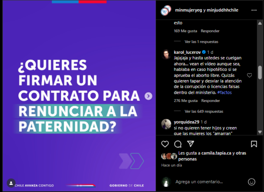 Sin embargo, sus declaraciones generaron críticas, incluyendo una respuesta del Ministerio de la Mujer, que calificó la idea como "abandono parental" y respondió indirectamente en redes sociales, señalando que renunciar a la paternidad es sancionable bajo la Ley Papito Corazón.