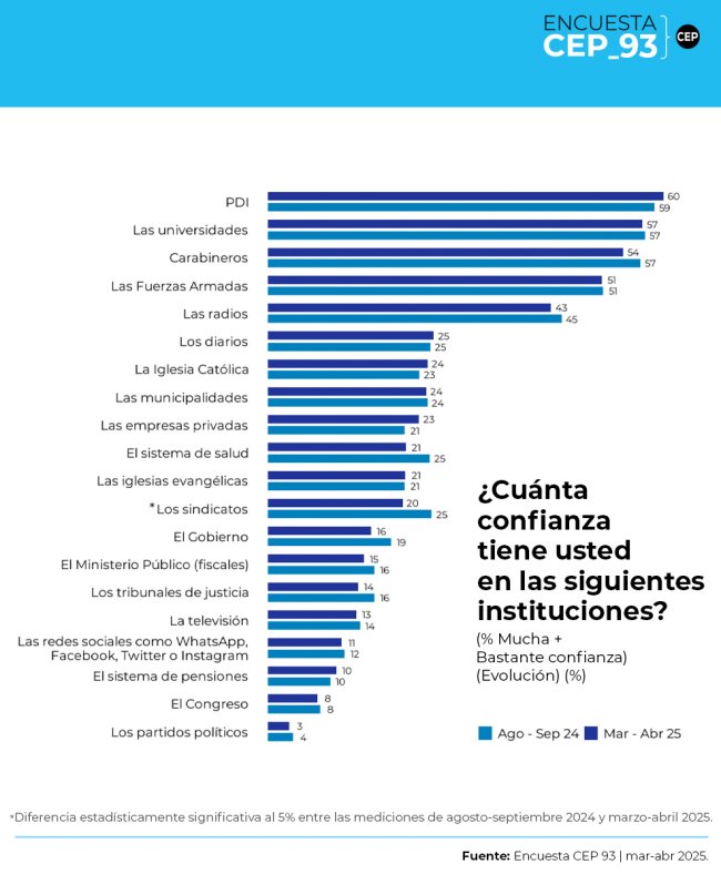 Luego aparecen universidades (57%), Carabineros (54%) y Fuerzas Armadas (51%). Entre los medios, los diarios tienen 25% de confianza y la televisión 13%; mientras que las redes sociales aparecen con 12%.