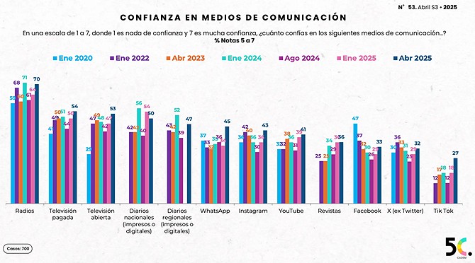 Además, se trata de un aumento de 6 puntos con respecto a la última encuesta -de enero 2025-, cuando la confianza en las radioemisoras llegó a 64%.