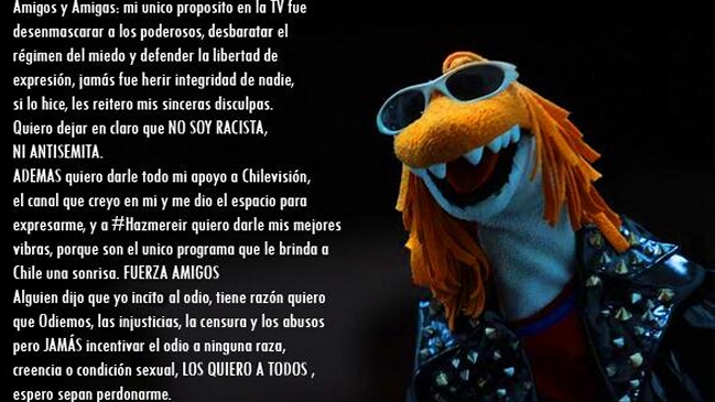 "Mi único propósito en la TV fue desenmascarar a los poderosos, desbaratar el régimen del miedo y defender la libertad de expresión, jamas fue herir la integridad de nadie, si lo hice, reitero mis sinceras disculpas. Quiero dejar en claro que no soy racista ni antisemita", manifestó en un comunicado.
