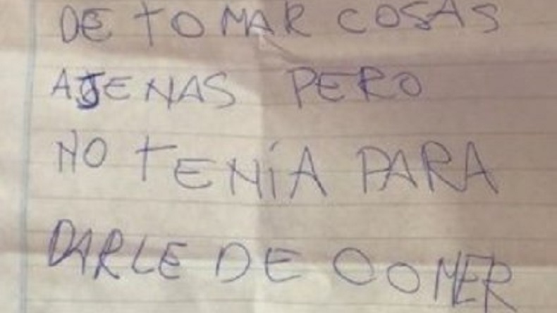 Al revisarla, hallaron el papel con el mensaje del ladrón, quien decía: "Perdón, yo no soy de tomar cosas ajenas, pero no tengo que darle de comer a mis hijos, así que la plata se la debo".