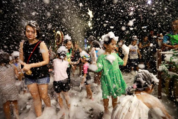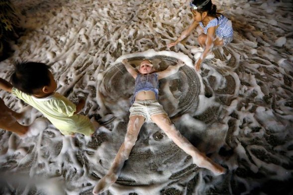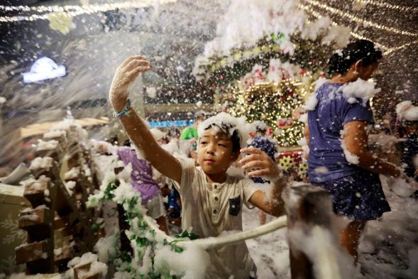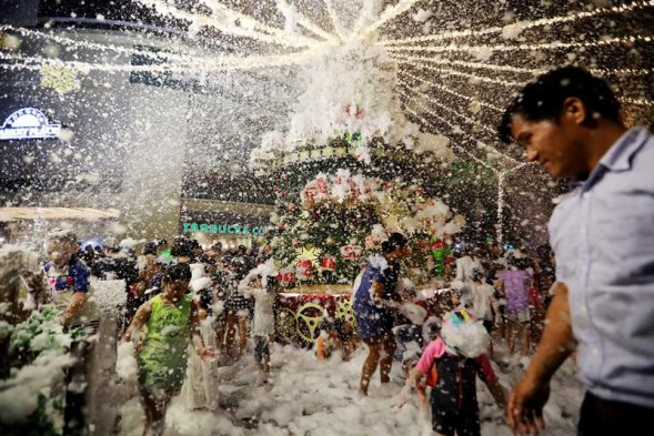 No es el Polo Norte, sino muy cerca de la Línea del Ecuador. En medio de un clima tropical y a falta de nieve, un centro comercial de Singapur festeja este viernes la víspera de la Navidad con espuma.