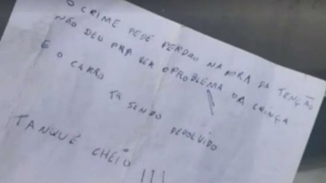 Tras hacer las revisiones correspondientes del vehículo, las autoridades encontraron una nota de los ladrones para Rosyneide Almeida, en la que le pedían disculpas por haberle robado el auto: "El crimen pide perdón. En el momento de la tensión, no pude ver el problema del niño. El auto está siendo devuelto. ¡Tanque lleno!", se leía en el mensaje.