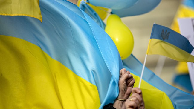 Se unieron a ucranianos y chilenos que se manifestaron con flores y pancartas contra la guerra.