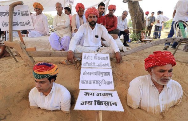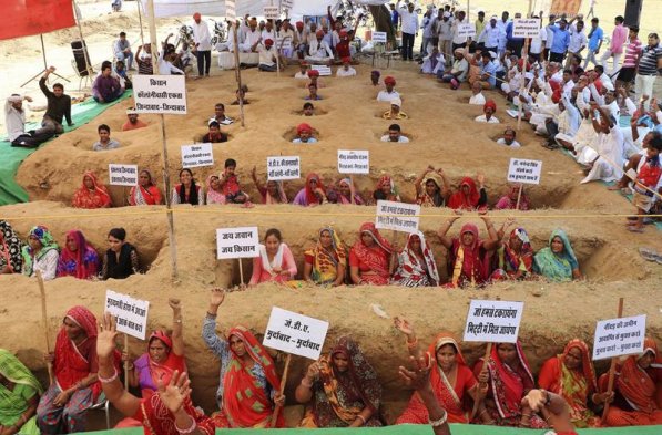 Granjeros indios permanecen enterrados en protesta en contra de una ley de tierras promovida por el Gobierno. El hecho se registra en la localidad de Nindar, a unos 20 kilómetros de Jaipur.