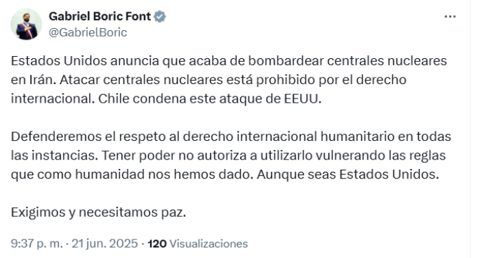 Boric advirtió que ataque de EE.UU. a instalaciones nucleares de Irán vulnera el derecho internacional