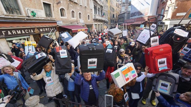 Alrededor de 500 venecianos, maleta en mano, protestaron este sábado en el centro histórico de la ciudad como parte de la convocatoria "Venexodus", denunciando que cada vez menos personas viven allí por la marea de turistas y al alto precio de la vida.