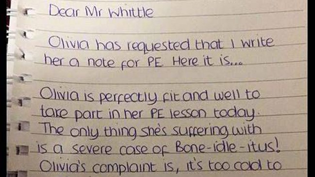 "Estimado señor Whittle: Olivia me pidió que le escribiera una nota para educación física. Aquí está... Olivia está en perfecto estado y bien para participar en su clase de educación física de hoy. ¡Sólo sufre un caso severo de 'flojeritis'! Olivia se queja de que hace demasiado frío para participar. ¿Puedo sugerir un par de vueltas adicionales para que entre en calor? Por favor, devuelva la nota a Olivia después de que la lea. Saludos, la señora McEvoy".
