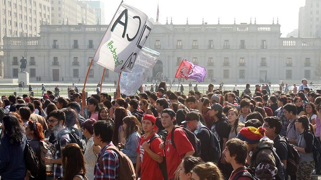 La manifestación de los estudiantes -la primera bajo el segundo Gobierno de Michelle Bachelet- tuvo uno de sus momentos más "simbólicos" durante el paso de la larga columna a lo largo de una hora frente al Palacio de La Moneda, tras una prohibición de dos años.