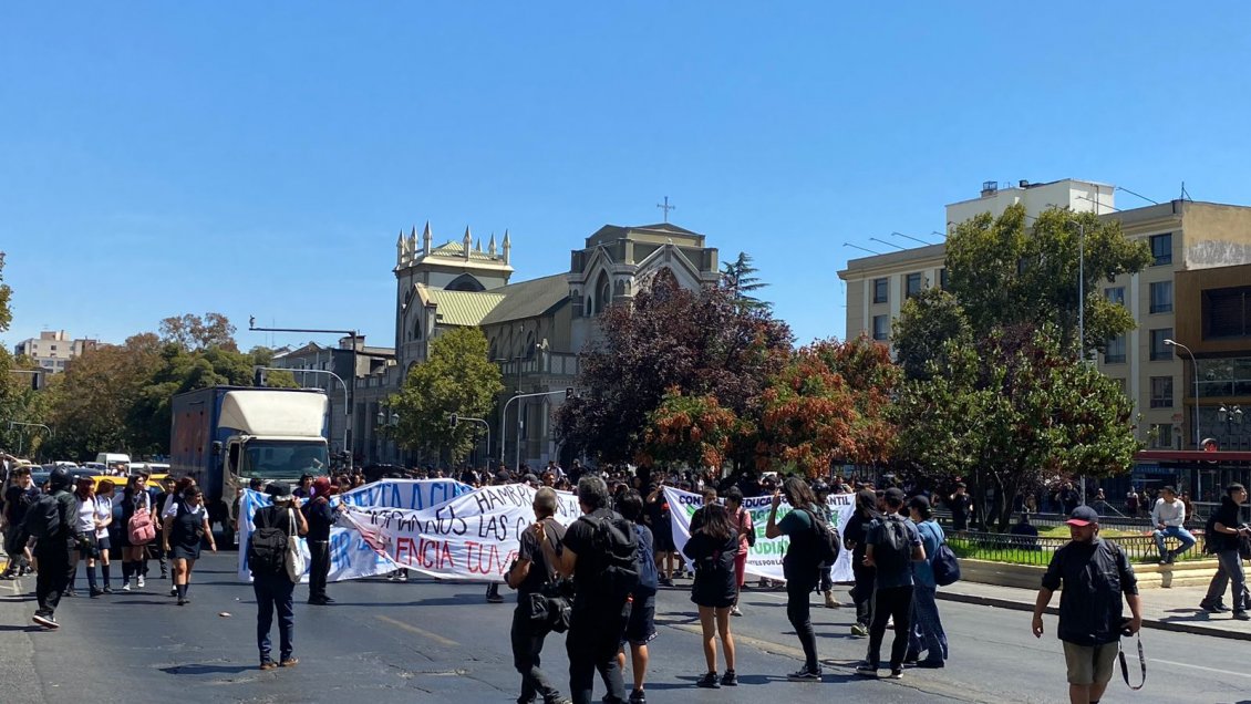 14:02 - | Los secundarios están siendo escoltados por Carabineros mientras que también se han realizado algunos cortes de tránsito por la principal vía de Santiago