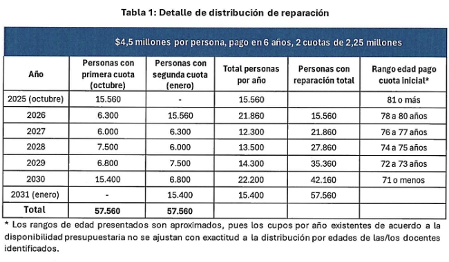 La medida de reparación contempla un pago de 4,5 millones de pesos a cada docente afectado vivo, partiendo por el grupo de mayor edad para continuar con los de menor edad sucesivamente.
