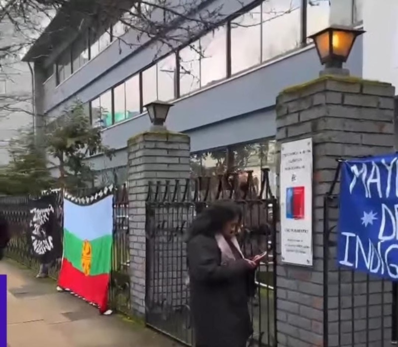Los manifestantes colgaron banderas y lienzos con distintas consignas en el exterior del recinto público, ubicado en calle General Mackenna, en el centro de la ciudad.