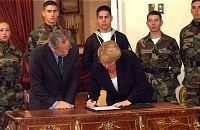 ![]() La Presidenta en plena firma del decreto que instauró el "Día del Conscripto". (Foto archivo: UPI) |