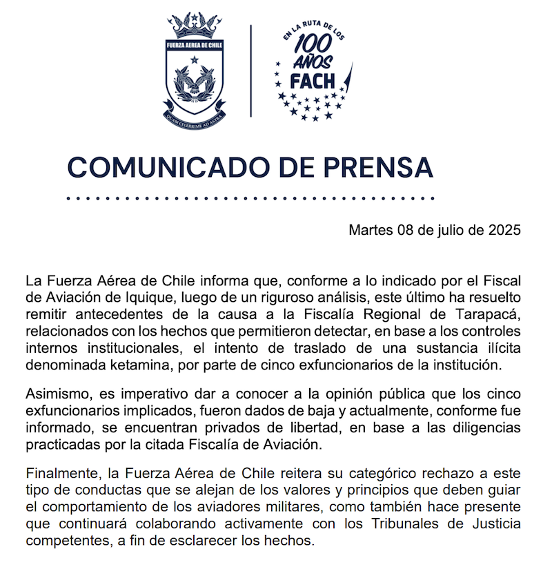 "Conforme a lo indicado por el fiscal de Aviación de Iquique, luego de un riguroso análisis, este último ha resuelto remitir antecedentes de la causa a la Fiscalía Regional de Tarapacá, relacionados con los hechos que permitieron detectar, en base a los controles internos institucionales, el intento de traslado de una sustancia ilícita denominada ketamina, por parte de cinco exfuncionarios de la institución", señala la misiva de la FACh.