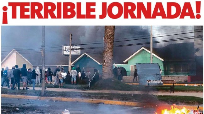 En páginas interiores, el diario detalla que la "terrible jornada de violencia" lo afectó en carne propia cuando "encapuchados irrumpieron cerca de las 20:00 horas y vandalizaron por completo el edificio ubicado en avenida Barros Luco".